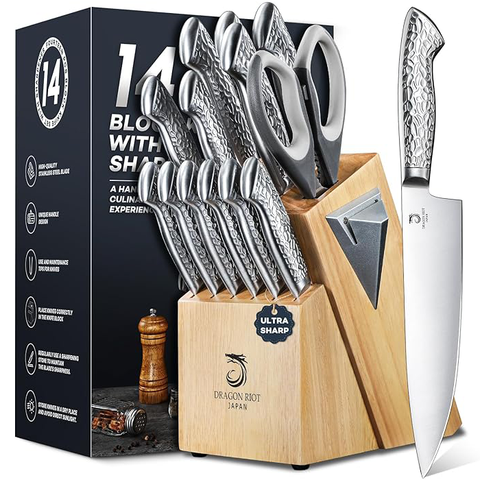 Juego de 14 bloques de cuchillos: el juego incluye cuchillo de chef de 8 pulgadas, cuchillo de pan de 8 pulgadas, cuchillo de rebanar de 8 pulgadas, cuchillo Santoku de 7 pulgadas, cuchillo utilitario de 5 pulgadas, cuchillo de pelar de 3.5 pulgadas, juego de 6 cuchillos de carne de 4.5 pulgadas, tijeras de cocina y bloque de madera maciza con afilador de cuchillos integrado.